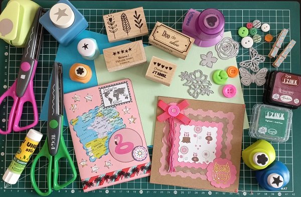 Création d’une carte personnalisée sur un thème choisi par le Duo avec les techniques de scrapbooking : découpes Big Shot/Perforatrices/embossage…