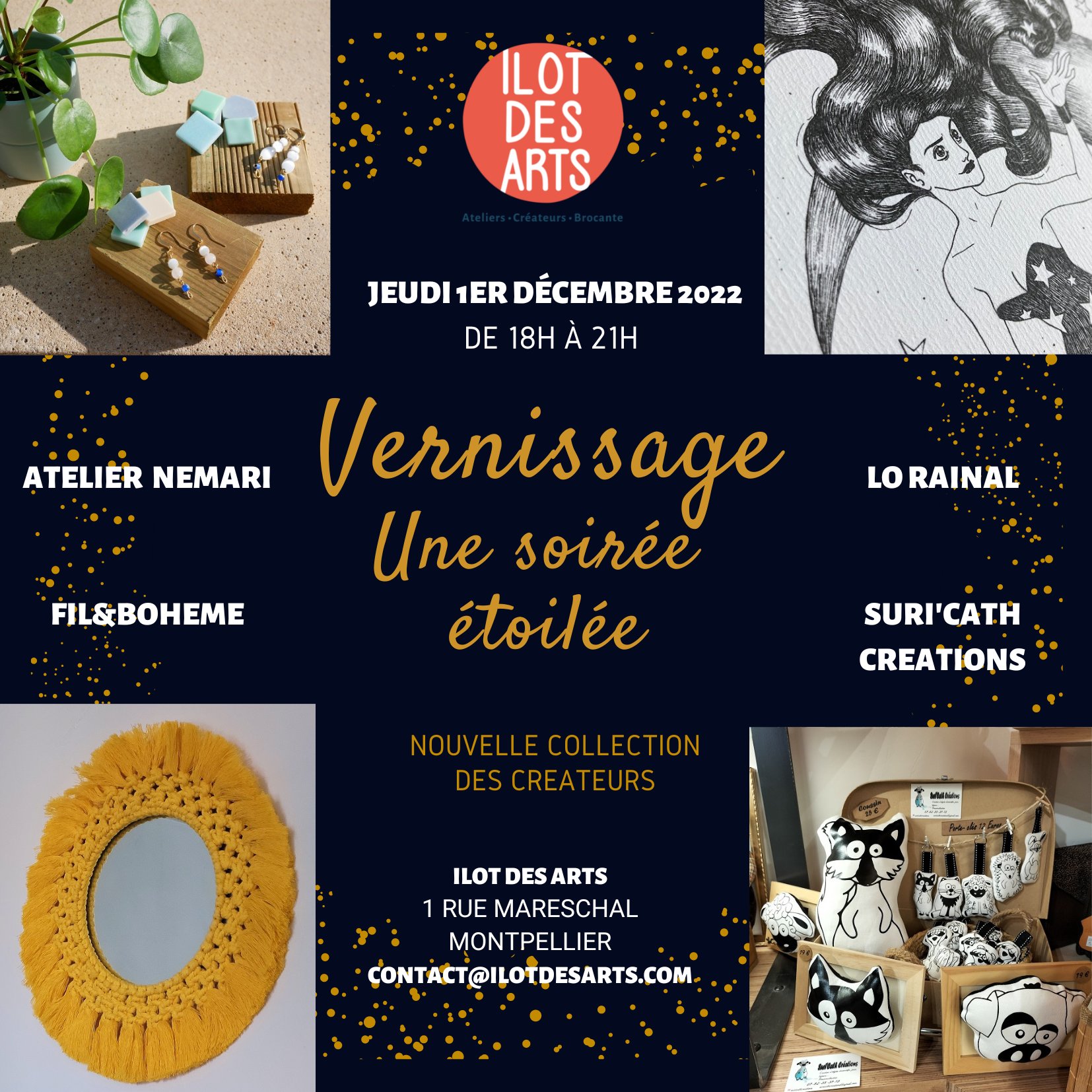 Vernissage de 4 créateurs Atelier Nemari – Bijoux Upcycling/Fil &Bohème – Macramé/Suri’cath Créations – Dessin textile/ Lo Rainal – Dessin carnet, à partir de 18h le Jeudi 1er décembre 2022.